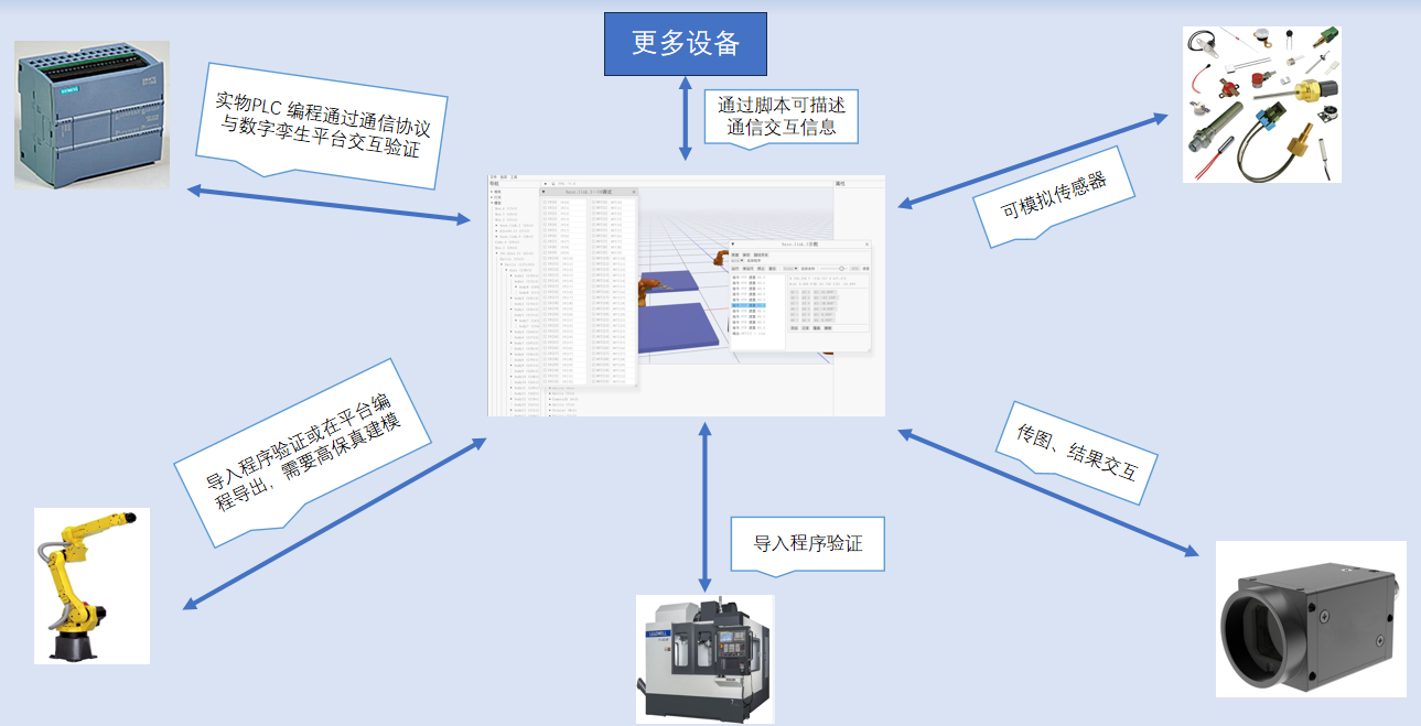 虚实仿真:如一些设备或功能模块无仿真支持,实物可以直接对接虚拟的三维场景。