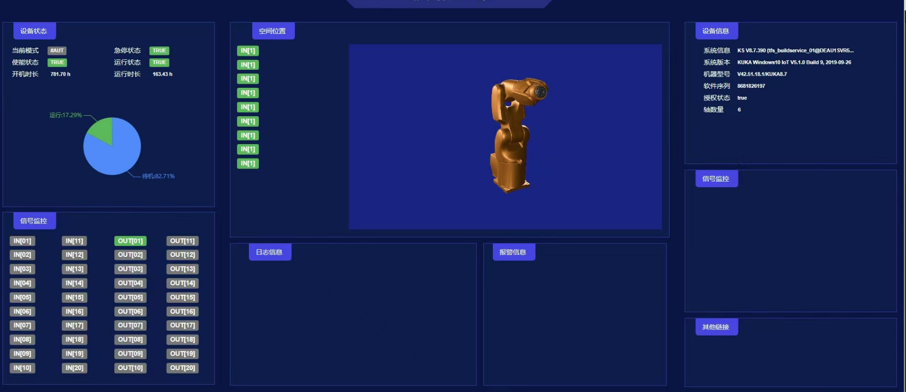 实时监控:通过数字孪生平台的可视化界面,实时显示机器人的运行状态(如关节角度、速度)、PLC的控制指令(如输出信号)、环境数据(如温湿度),实现“一眼看全”生产现场。
